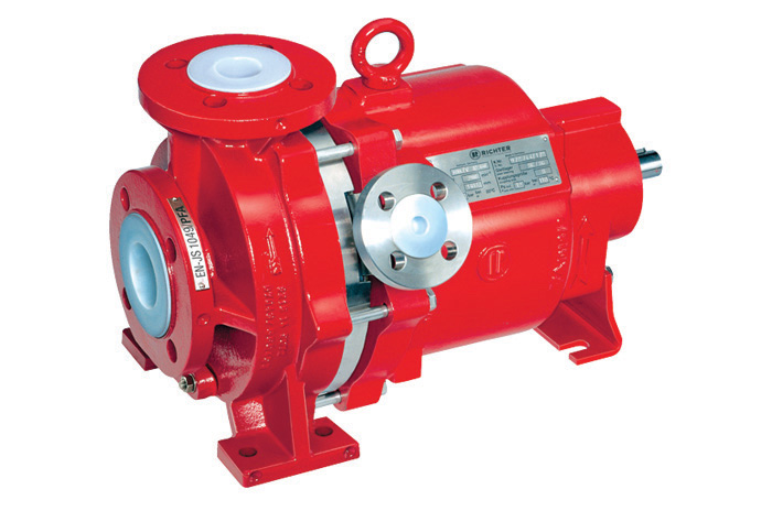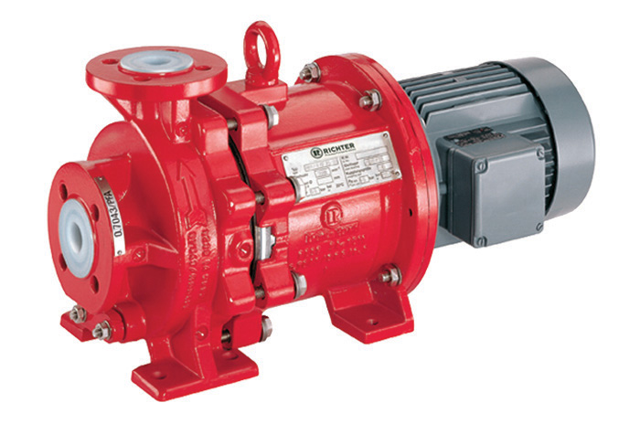 Magnetic drive and mechanical seal chemical process pumps of space-saving, close-coupled design, PFA/PTFE and PE-lined